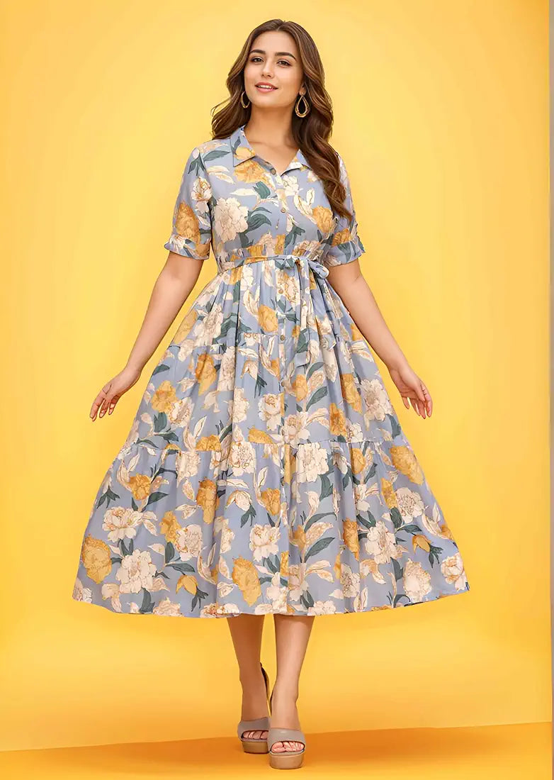 VK Floral printed calf length dress in cotton fabric. It has shirt collar, tie-up belt and half sleeves. Dress length -47'' Inch. Wear it will casual shoes for cool and comfy look.